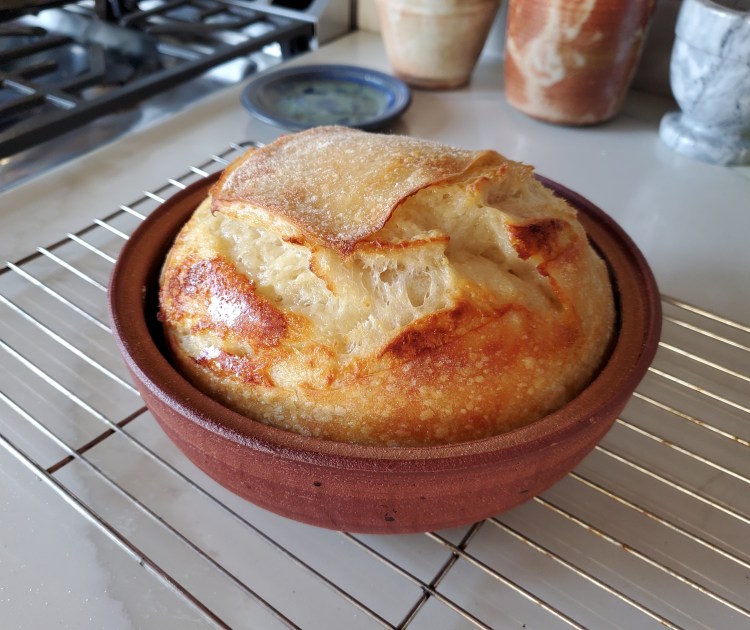 When dough is added to the pre-heated cloche, the finished bread does not stick.