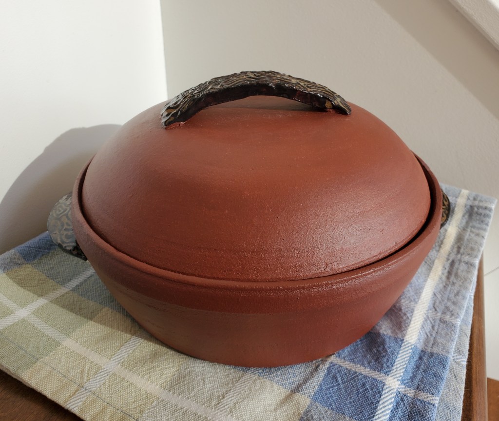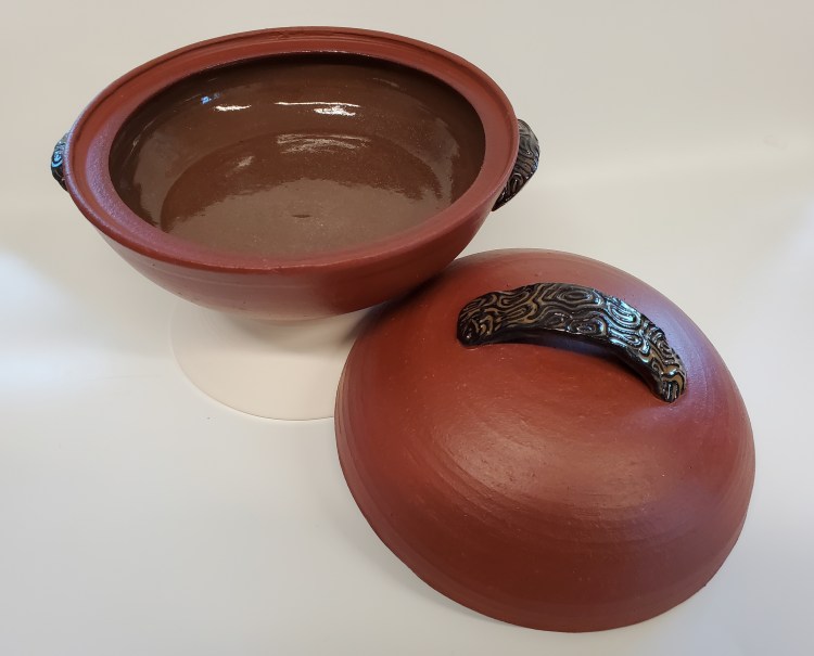 I brush the bowl and lid with a super fine clay slip and burnish it again.